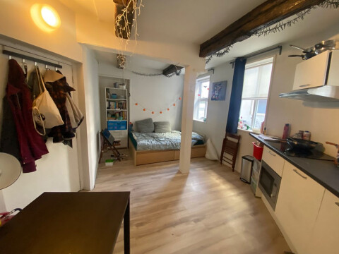 Bij binnenkomst kom je in een lichte en ruimtelijke woonkamer met een open keuken. De grote ramen zorgen voor een fijne hoeveelheid daglicht. De keuken heeft een moderne afwerking en is voorzien van diverse apparatuur. De studio beschikt tevens over een eigen badkamer, uitgerust met alle benodigde voorzieningen.