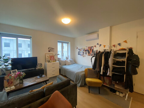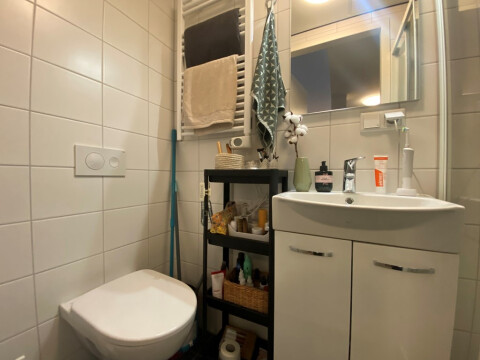 Bij binnenkomst stap je direct de lichte woonkamer met open keuken binnen. Grote ramen zorgen voor veel natuurlijk licht. De moderne keuken is volledig uitgerust met een inductiekookplaat, koelkast, oven/magnetron, afzuigkap en vaatwasser. De badkamer is keurig afgewerkt en van alle gemakken voorzien.