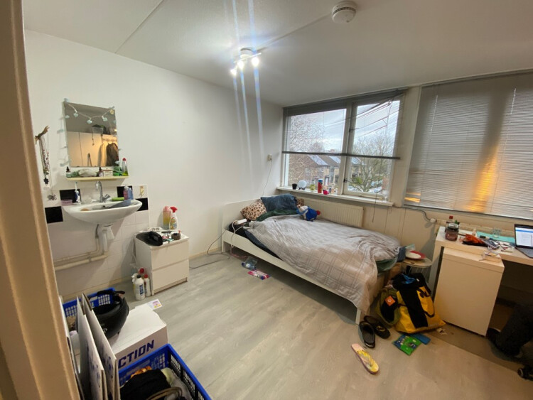 De kamer is circa 17m en biedt genoeg plek voor een tweepersoonsbed en opbergmeubels. De keuken en badkamer worden met 4 andere huisgenoten gedeeld.
